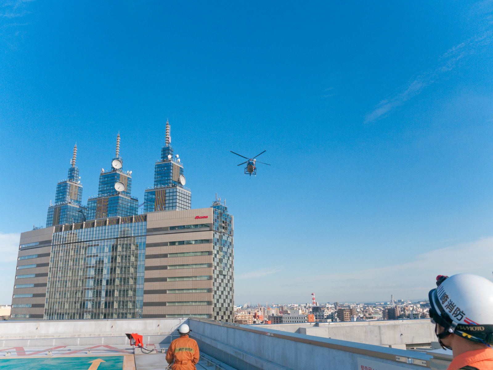 ふと気づけば、ヘリの隊員に手を振る病院職員・・・・